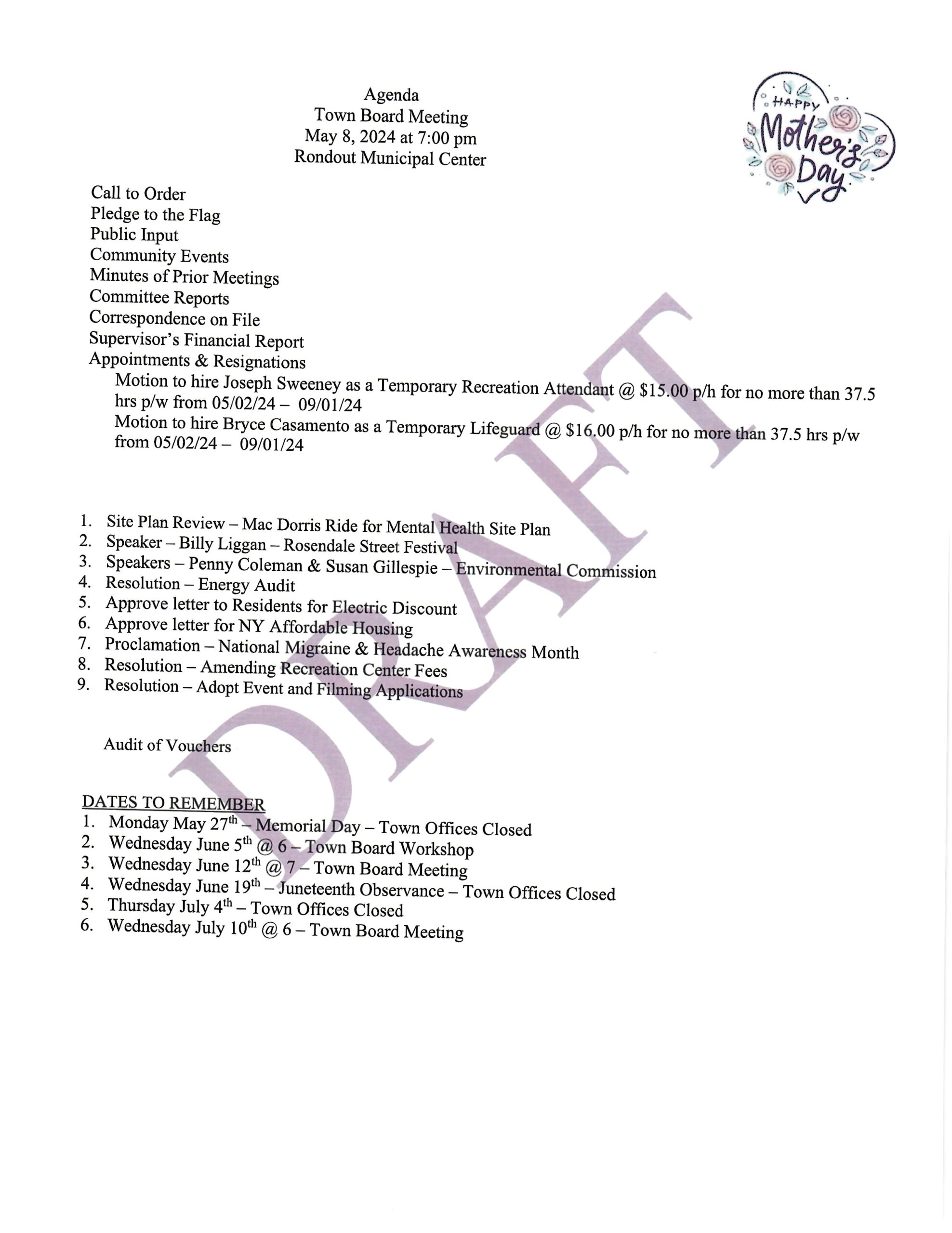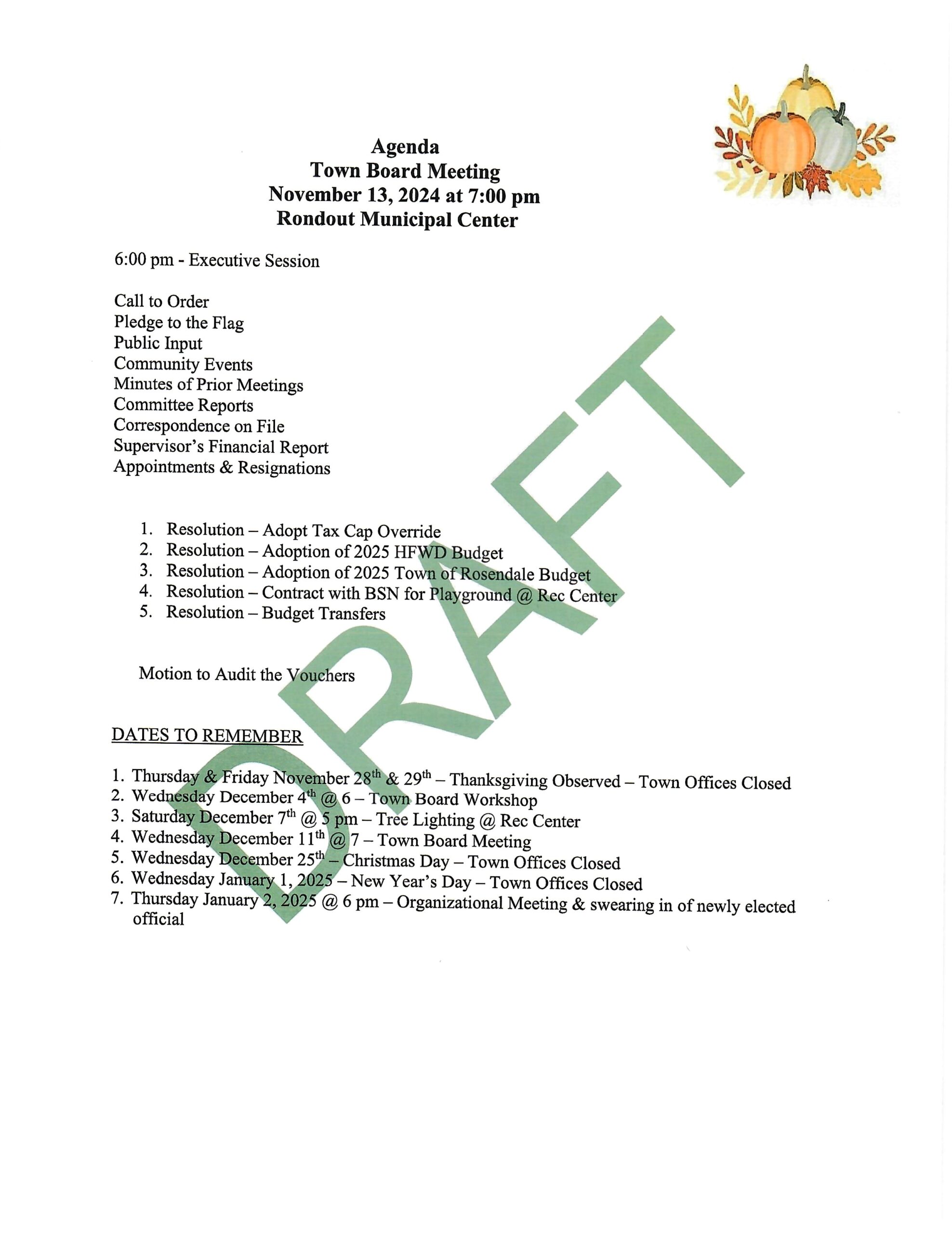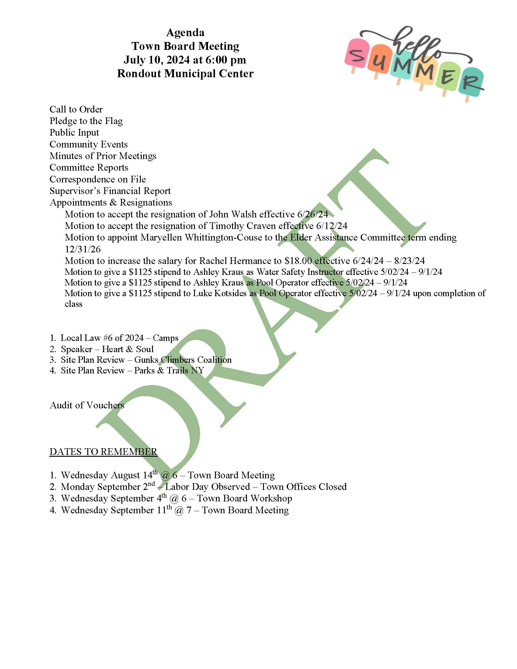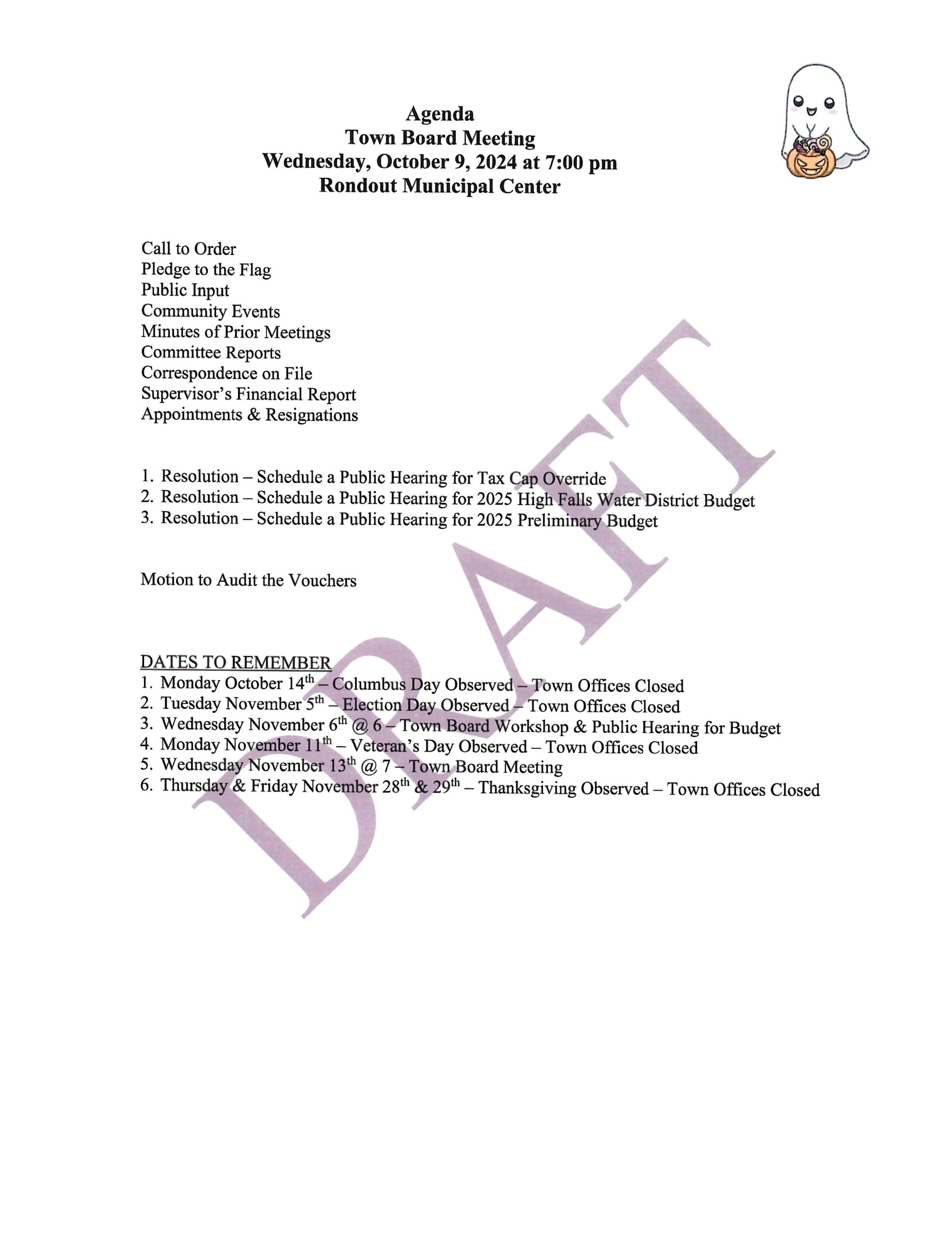 Town Board Draft Agenda Wednesday, October 9, 2024
