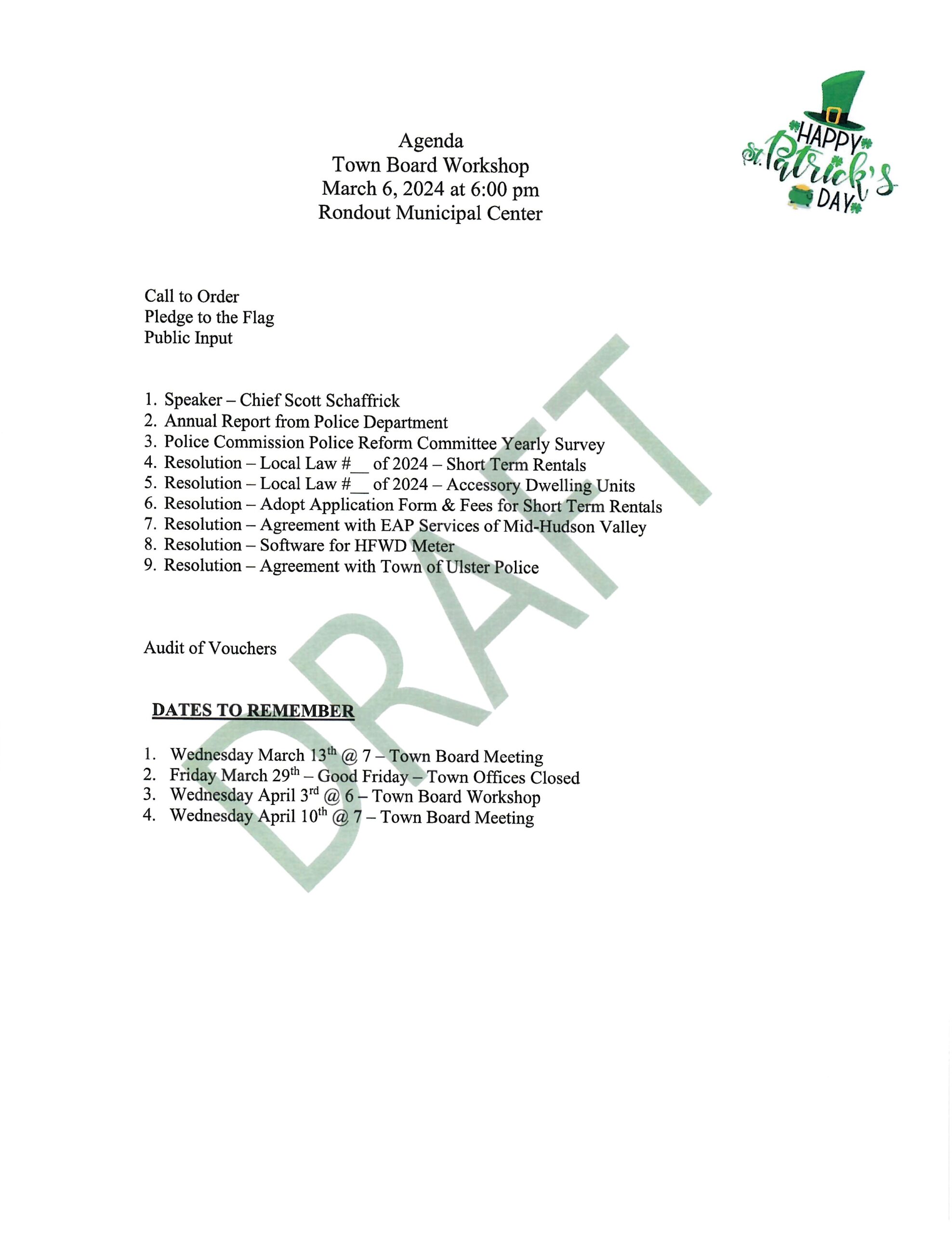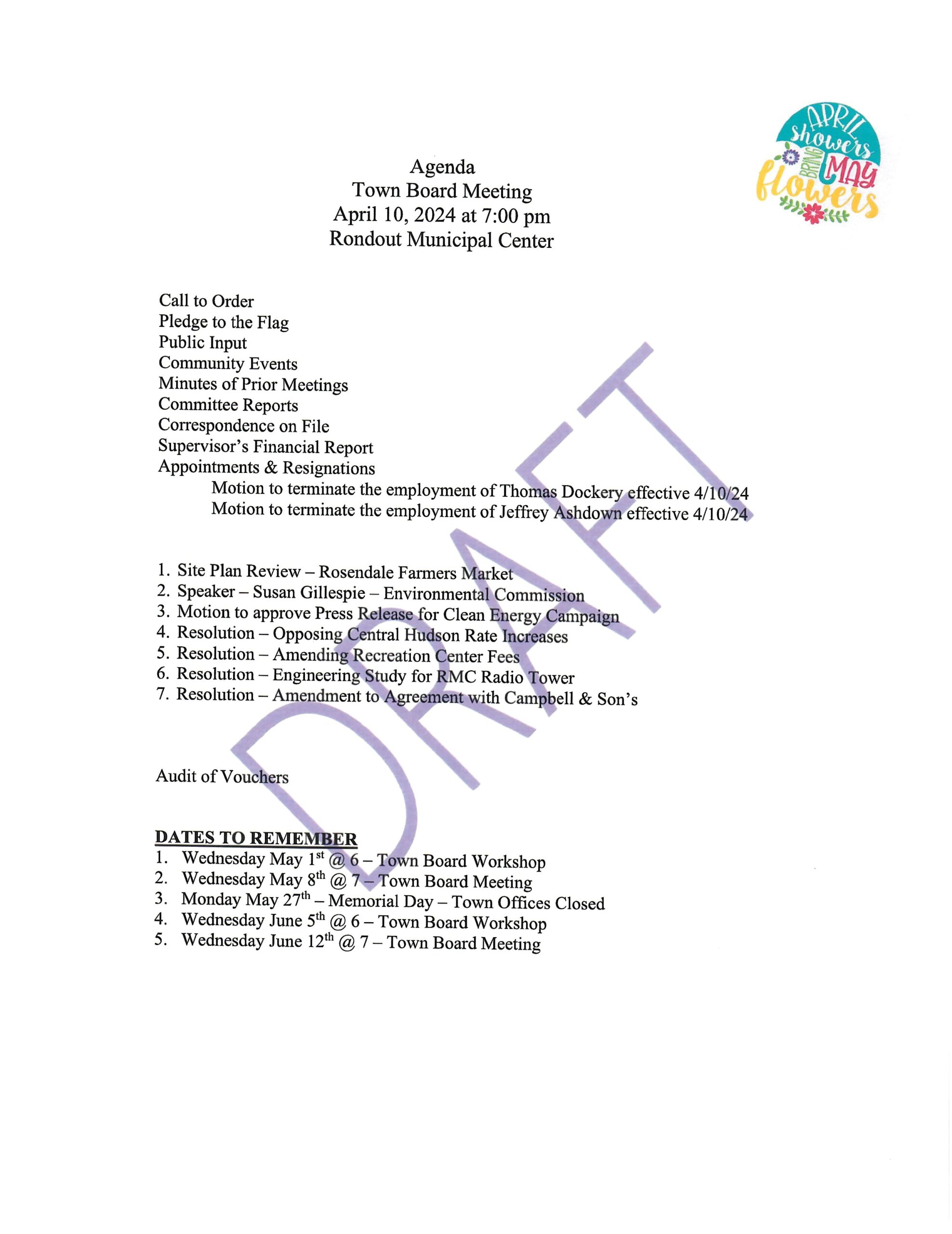 Town Board Draft Agenda April 10, 2024