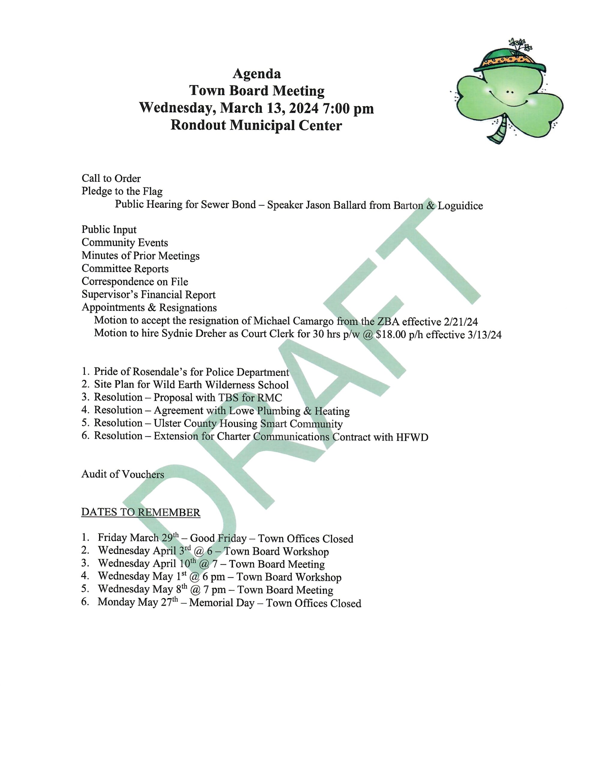 Town Board Draft Agenda March 13, 2024