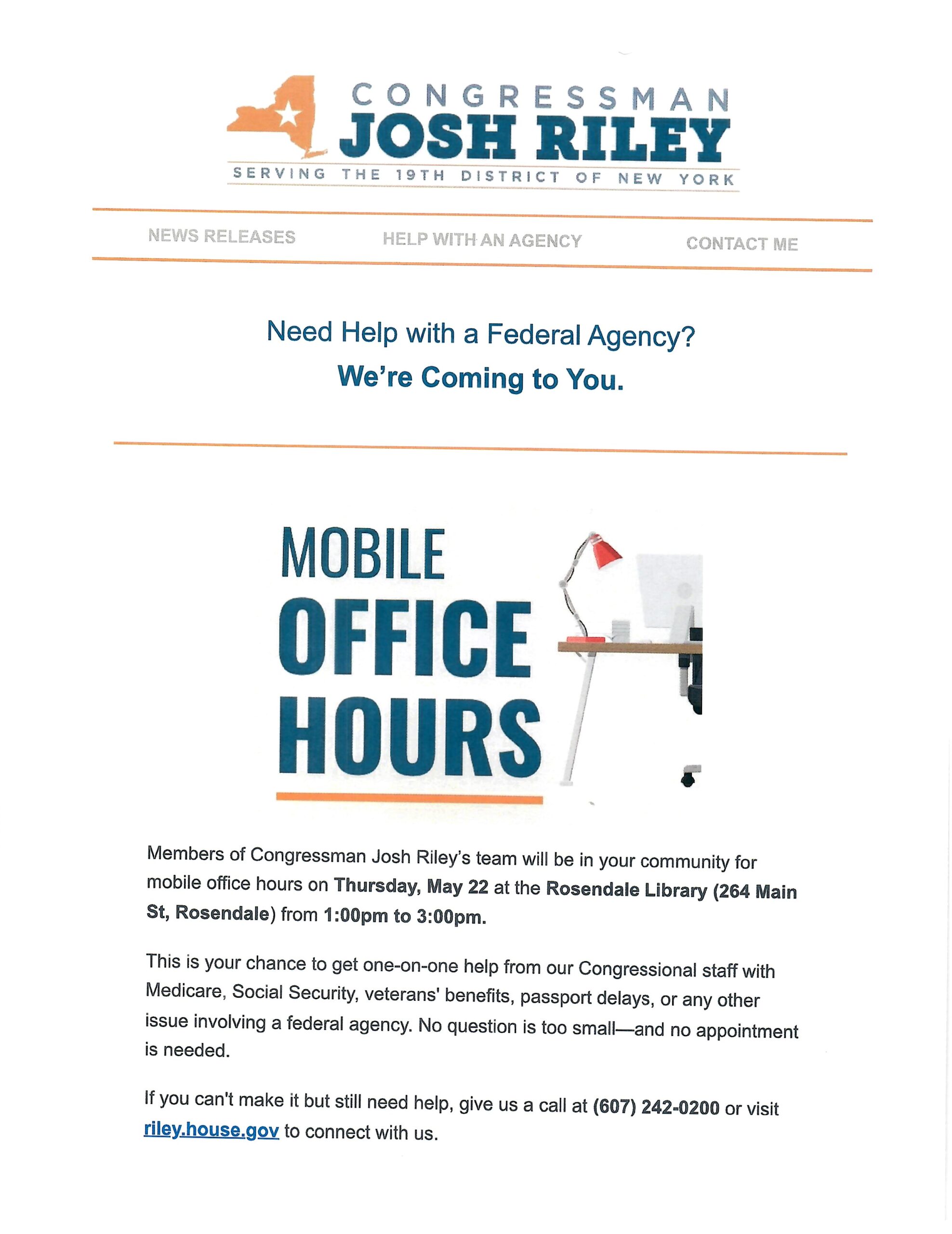 HOME > Congressman Josh Riley 19th District Rosendale Mobile Office Hours