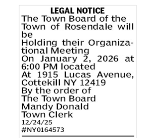 HOME > Legal Notice: The Town Board of The Town of Rosendale will have their meeting on Jan. 2, 2026 at 6:00pm