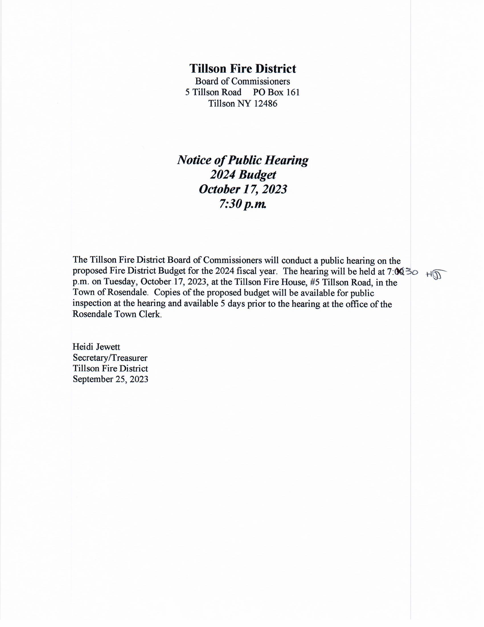 HOME > Public Hearing Tillson Fire District Proposed Budget