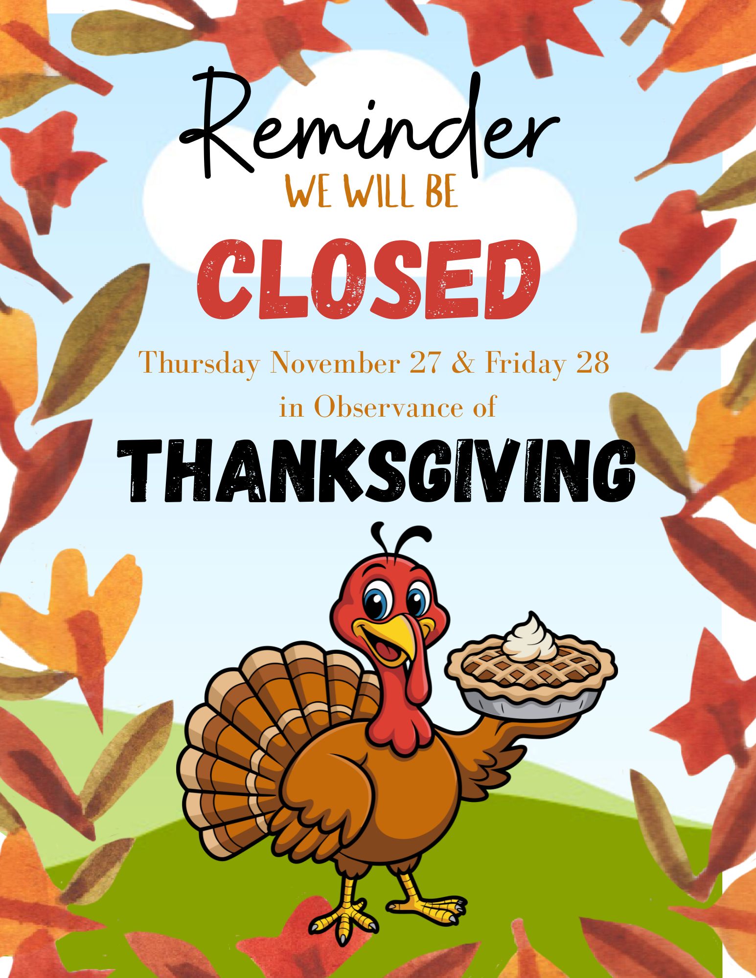 HOME > Reminder that we will be closed on Nov 27 & 28 for Thanksgiving